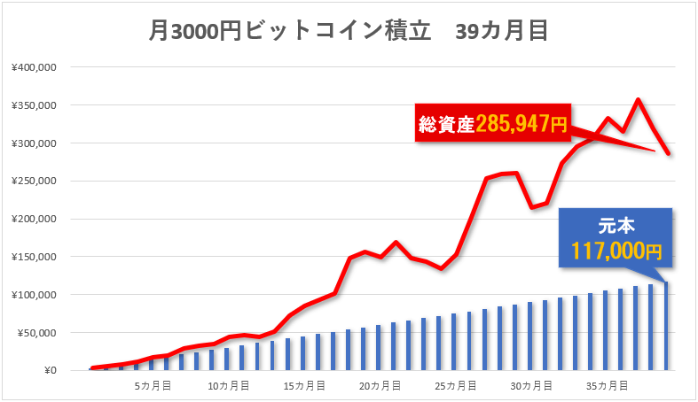 ビットコイン積立投資39カ月目の結果は+168,947円(投資額117,000円、評価額285,947円)、投資利益率(利回り)144.4%です。