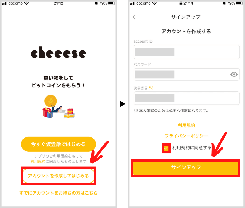 ▼「アカウントを作成してはじめる」をタップし、「利用規約に同意する」にチェックしたら「サインアップ」をタップ