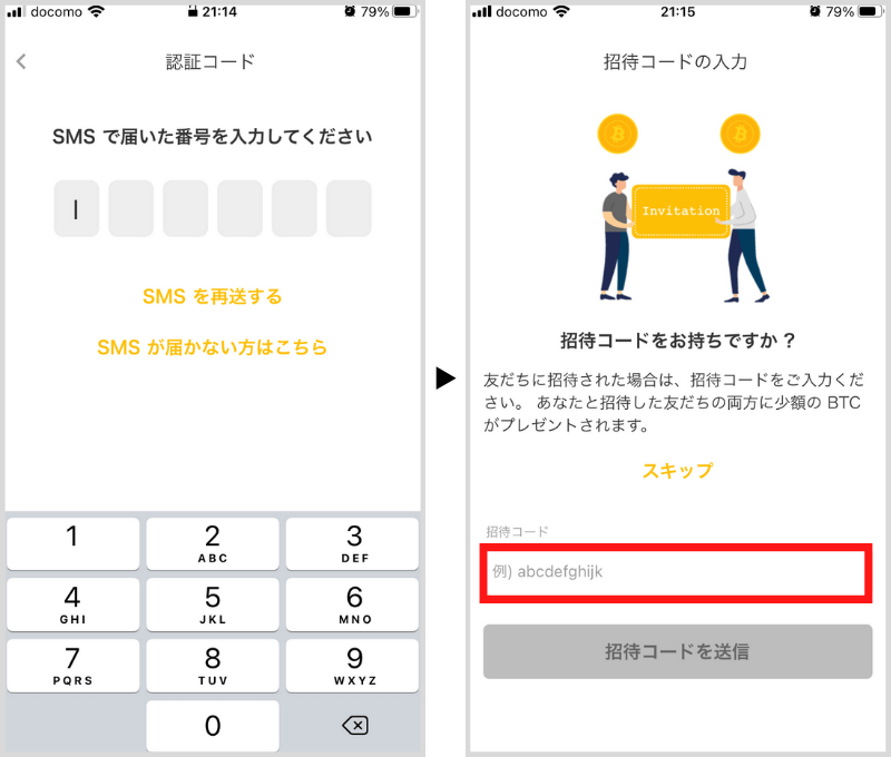 ▼SMSに届いた番号を入力し、招待コードをお持ちの方は招待コードを入力します