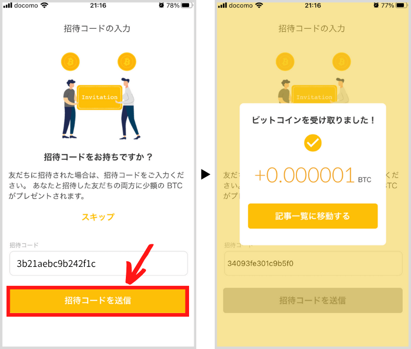 ▼「招待コードを送信」をタップすると「0.000001BTC」が受け取れます