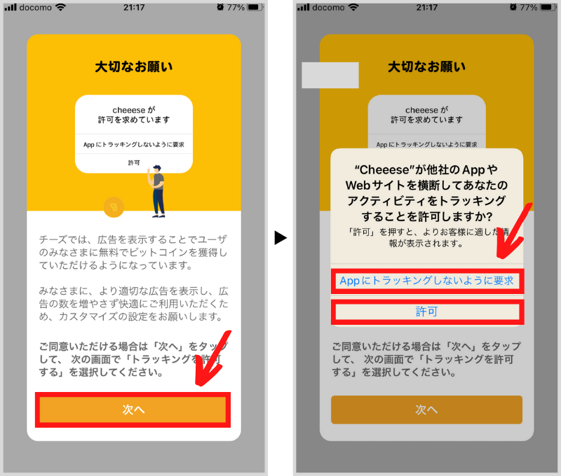 ▼「次へ」をタップし、トラッキングを許可するかどうか選択(どちらを選択してもOK)