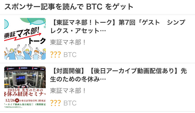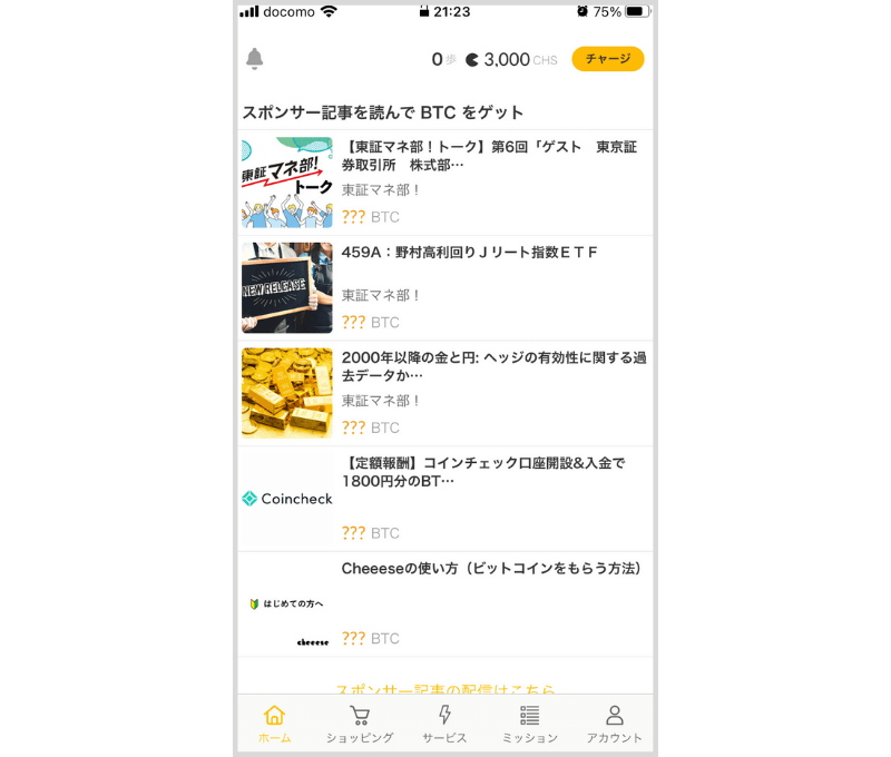 Cheeeseアプリでは、様々な企業からのスポンサー記事が掲載されており、これらを読むことでビットコインを獲得できます。