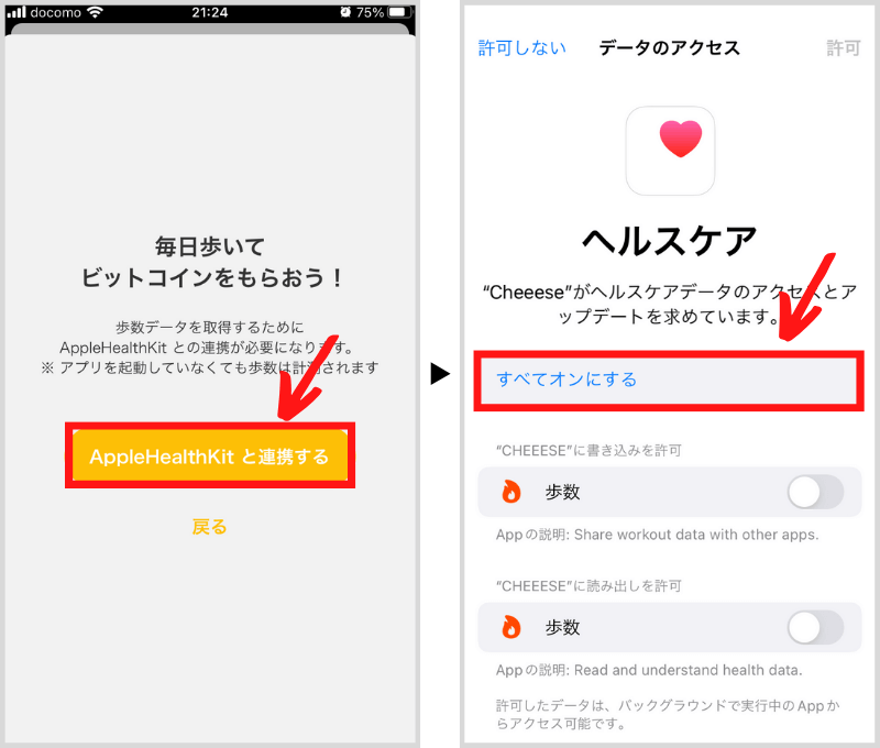 ▼「AppleHealthKitと連携する」をタップし「すべてをオンにする」をタップ