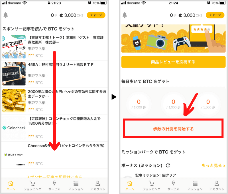Cheeeseは、歩くだけでなく、ニュース閲覧、商品レビュー、ミッションクリア、ショッピングなど多様な方法でビットコインを無料で稼げるアプリです。