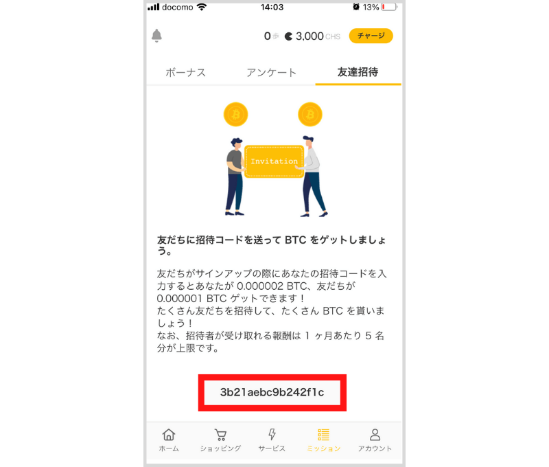 招待コードを入力すると0.0000001BTC(ビットコイン)もらえます。