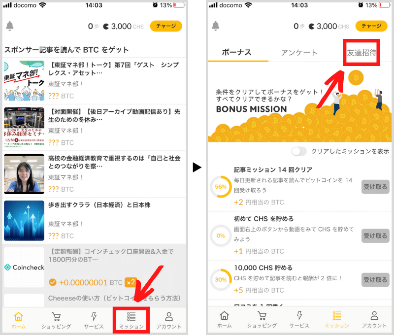 ▼画面下の「ミッション」をタップし、「友達招待」をタップ