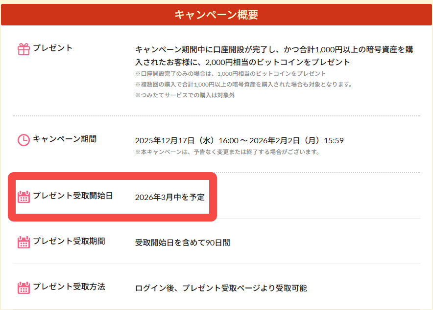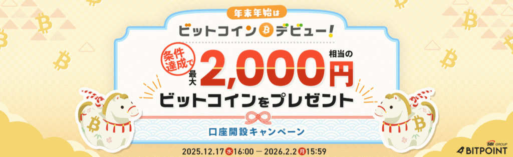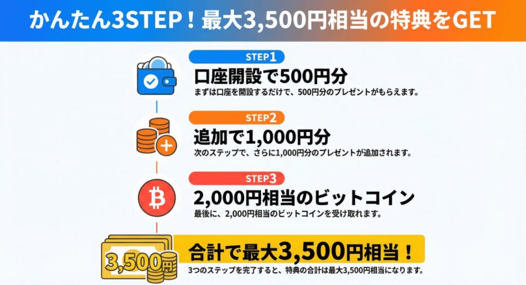 | 口座開設キャンペーン (期間限定) | 口座開設 1000円以上の暗号資産購入 | 2000円相当のビットコイン |
