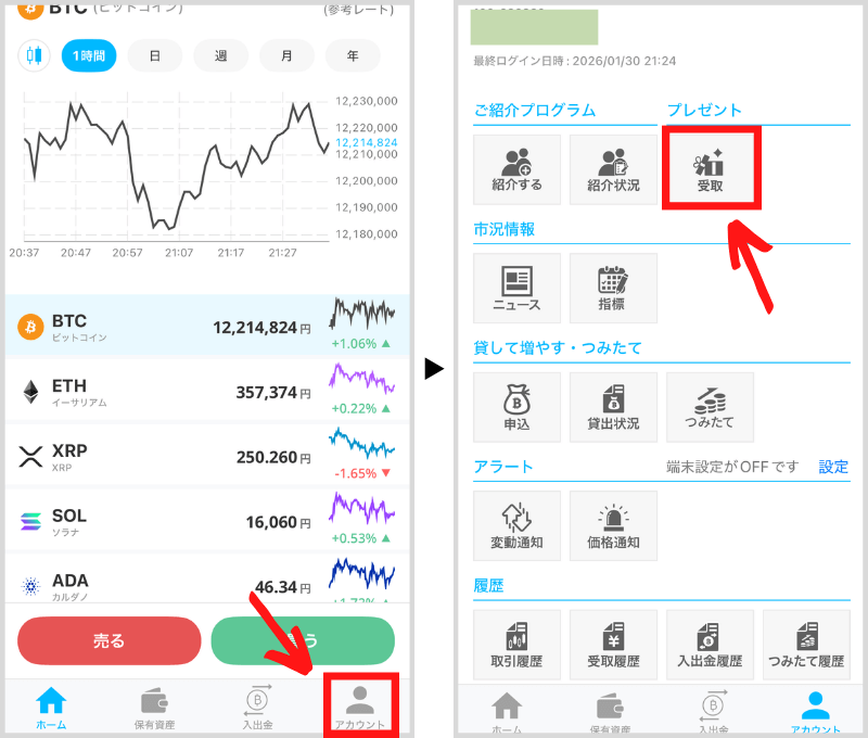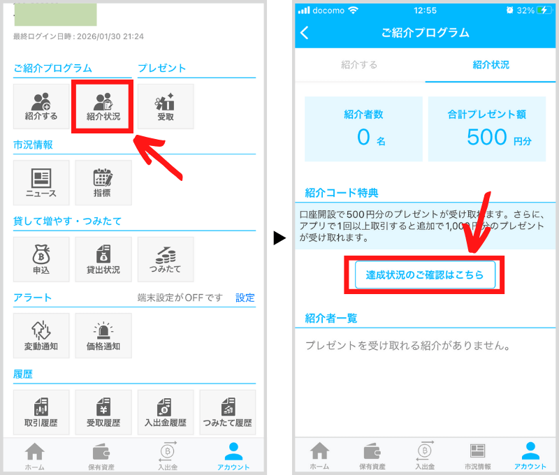 口座開設後メニューから「ご紹介プログラム」を選択し「受取」をタップしてプレゼントをもらってください。