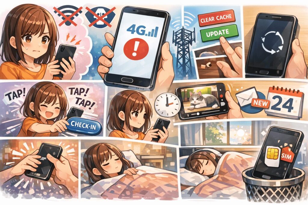 アプリのキャッシュ削除やアップデート、端末の再起動で動作が安定する場合もあります。
