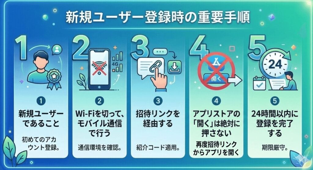 招待リンクからアプリをダウンロードしたら、インストール後は一度ストアを閉じ、再度招待リンクをタップしてアプリを起動することが、報酬を確実に得るための鉄則です。アプリストアの「開く」ボタンから起動すると招待が反映されない場合がありますので注意してください。