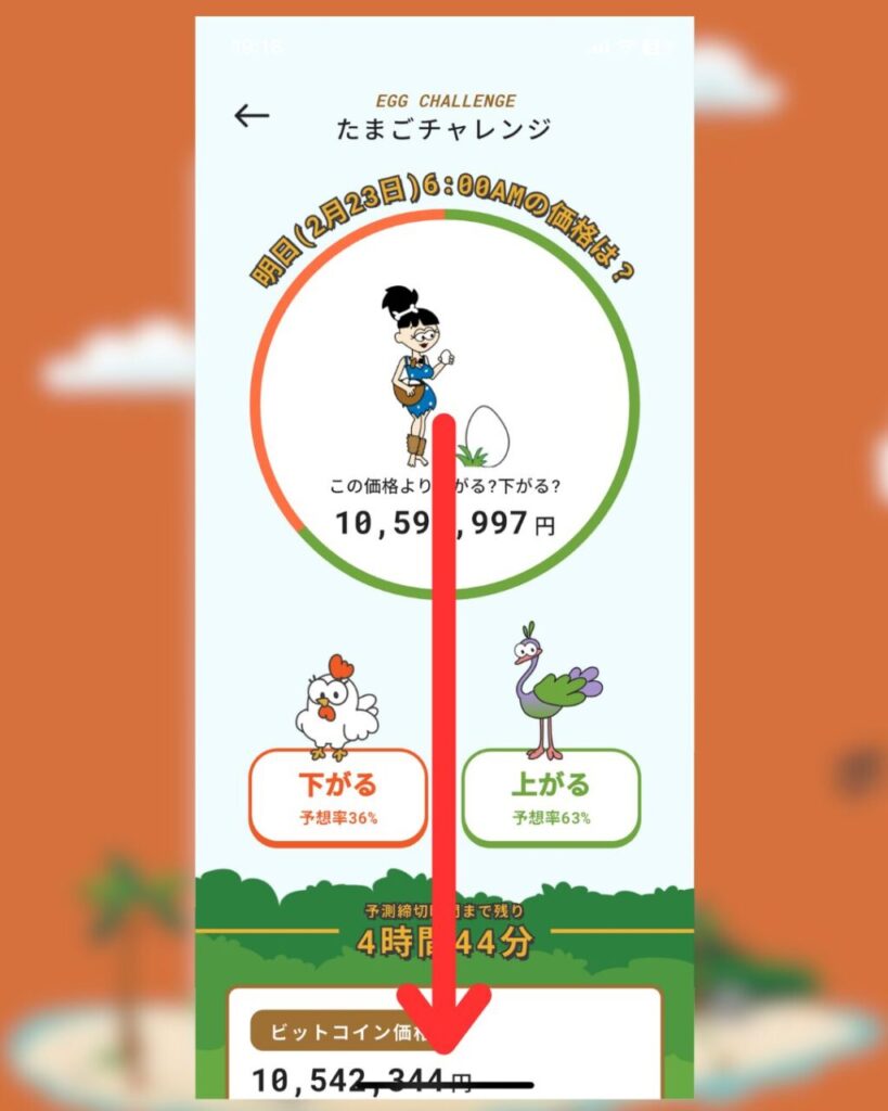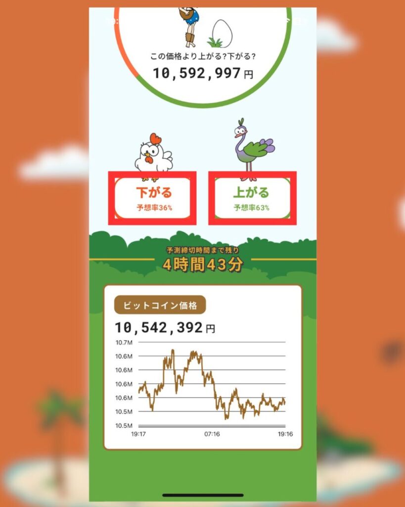 ▼チャートを見るなどして予想し「下がる」または「上がる」をタップしましょう
