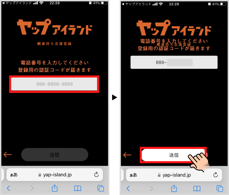 ▼回答が終わったら携帯の番号を入力し送信をタップ