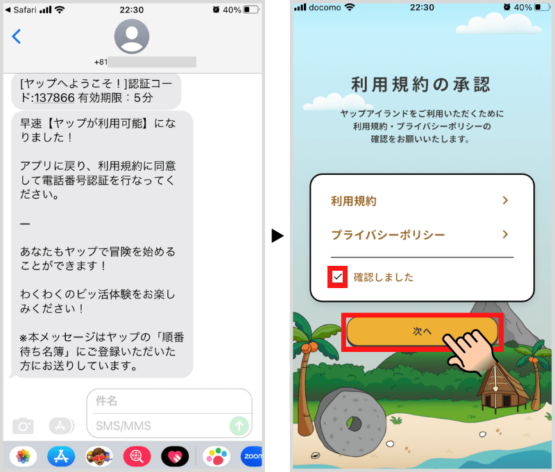 ▼認証コードを確認したらアプリに戻り利用規約を確認し「次へ」をタップ