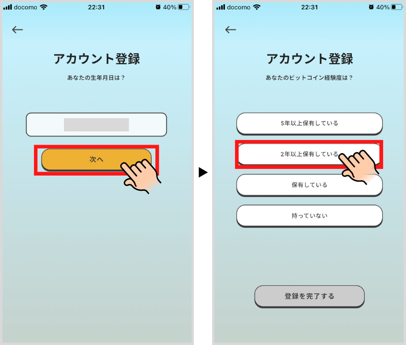 ▼質問に回答したら「登録を完了する」をタップするとヤップアイランドを始めることができます