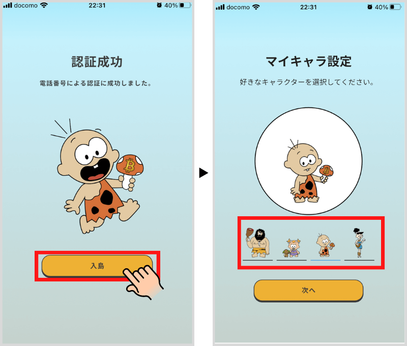 ▼認証に成功したら「入島」をタップし、好きなキャラを選びます